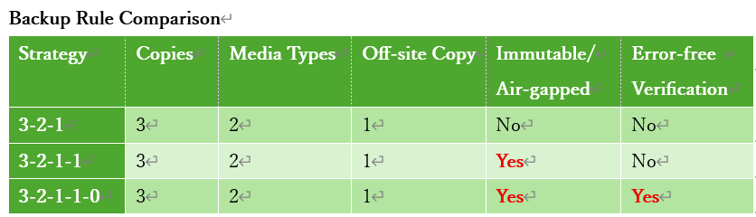 - 3 – 2 – 1 – 1 Rule adds one immutable or air-gapped copy.