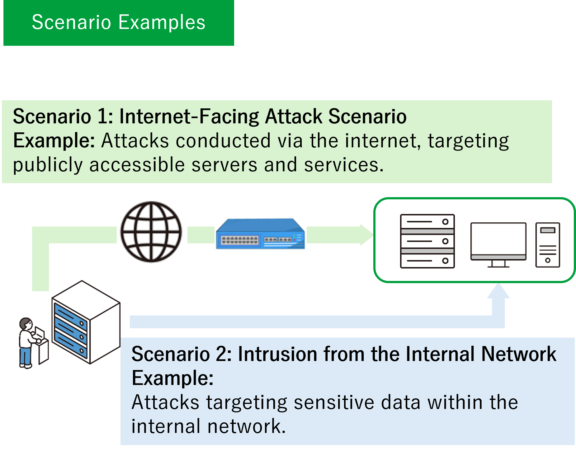 Based on attacks that have been observed and reported in real-world environments, we prepare the following two types of testing scenarios.