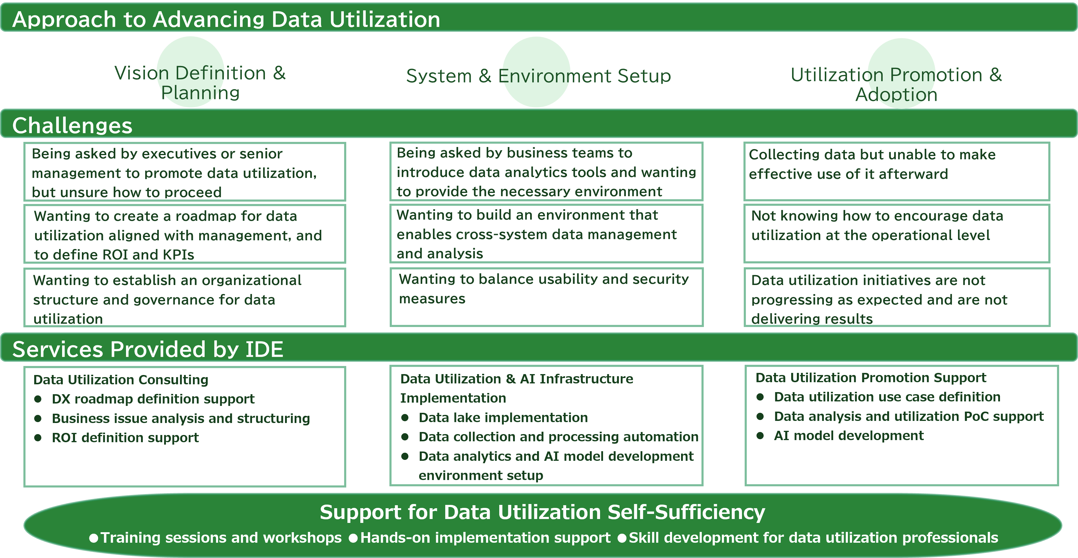 A data warehouse is a database system that centrally manages data collected from multiple business systems, enabling cross-system analysis and effective data utilisation.We provide end-to-end support for data warehouse initiatives—from upstream design and implementation through to post-implementation adoption, utilisation, and operational stabilisation.Through our Data Utilization Consulting service, we support the design and implementation of a data utilisation platform that enables service enhancement and the creation of new business value.